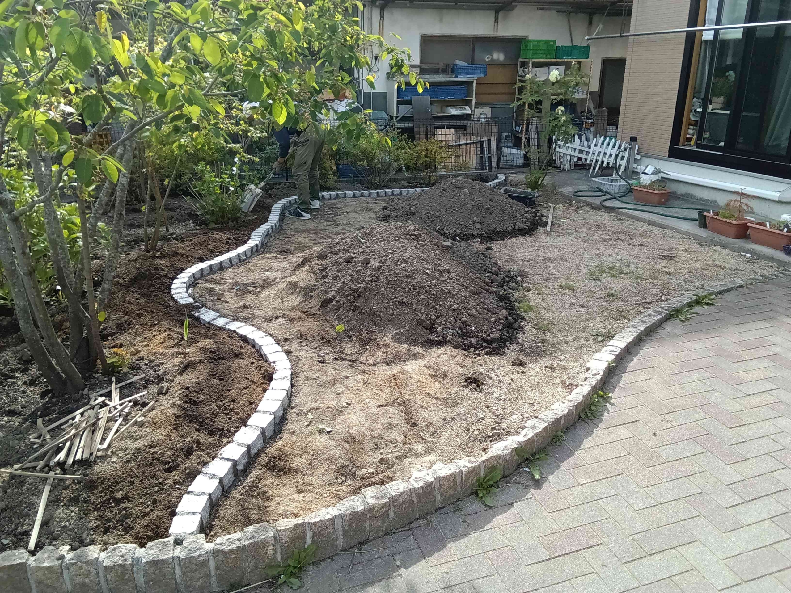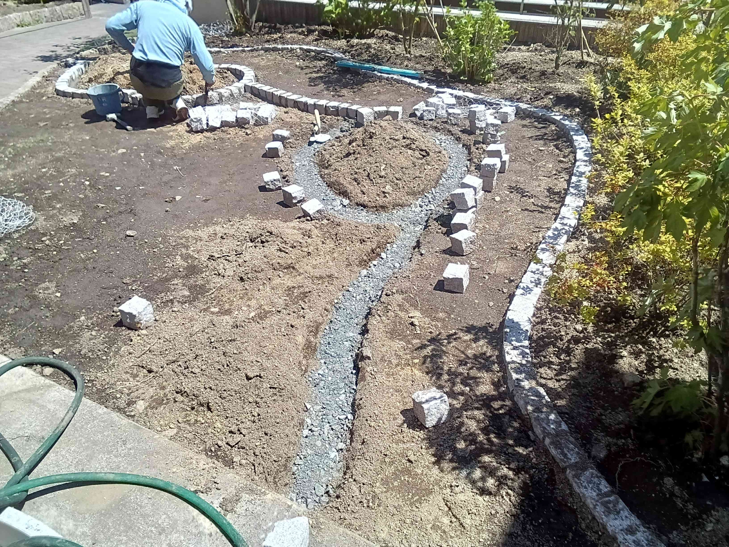 お庭の通路見切りに使用したのは現在アプローチに使用している材料と同じピンコロ石です。