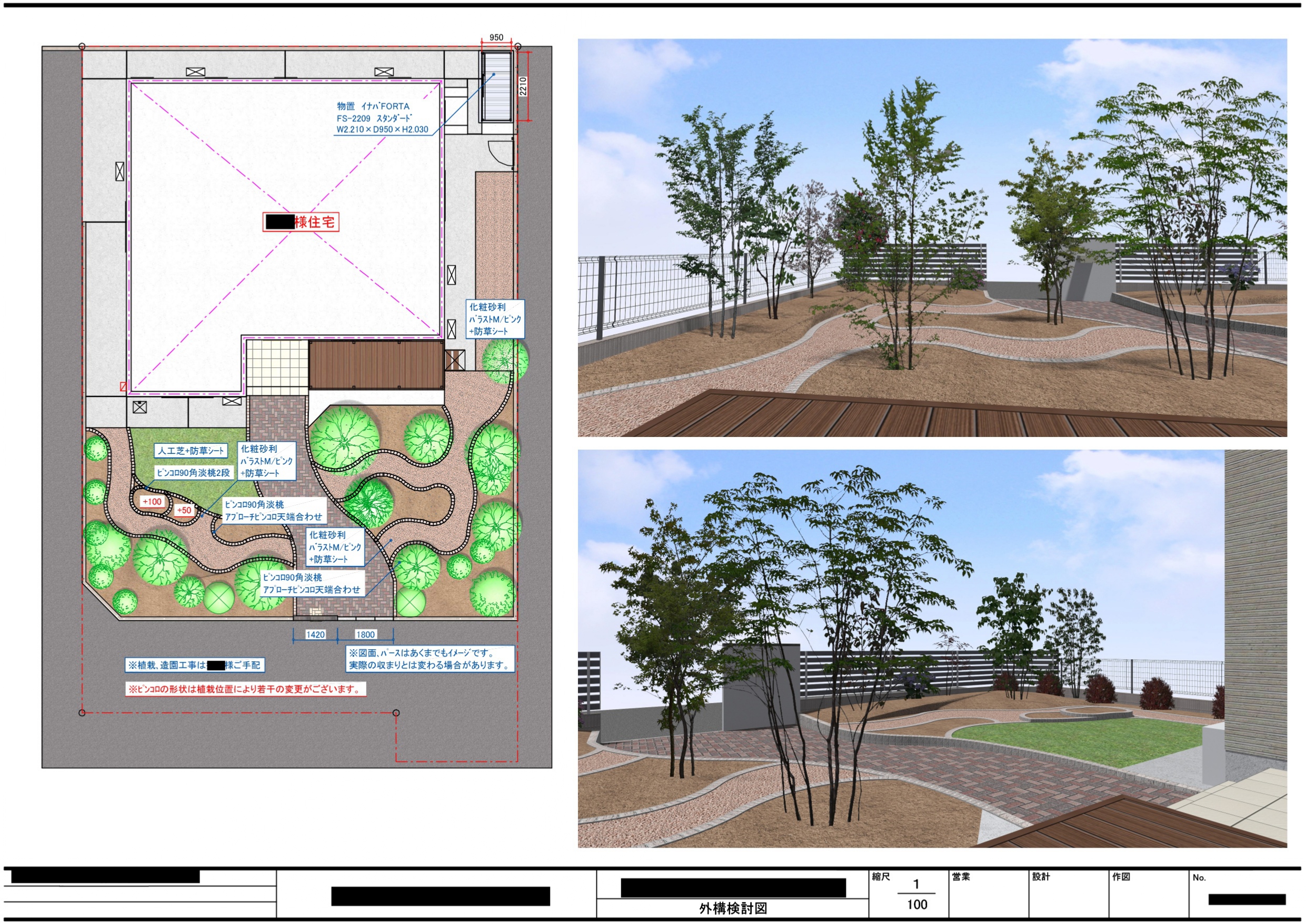 庭木と草花スペースにアプローチと人工芝のご要望を頂き、たたき台のご提案から数回の打合せ後決定しました。