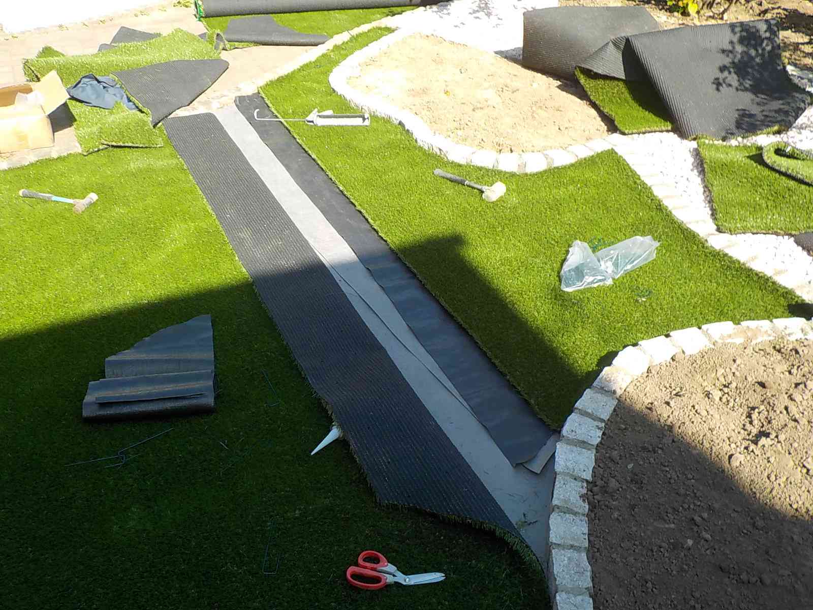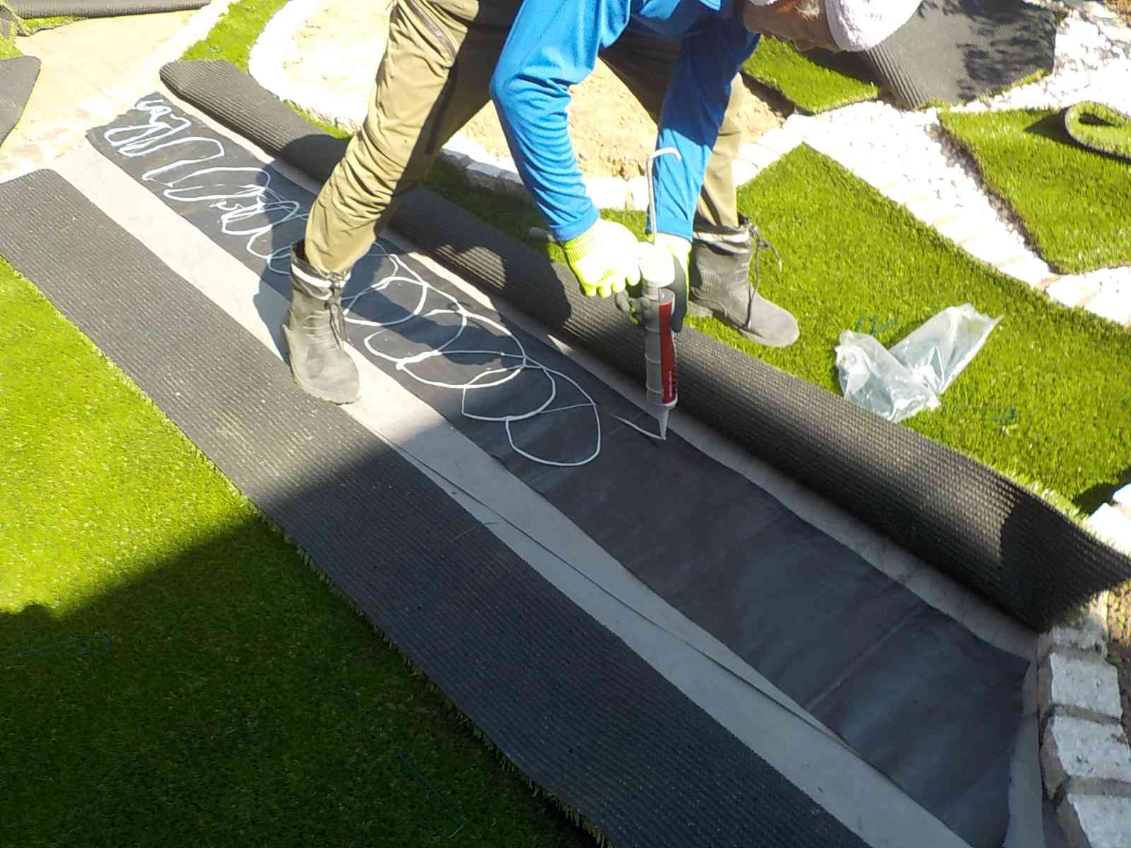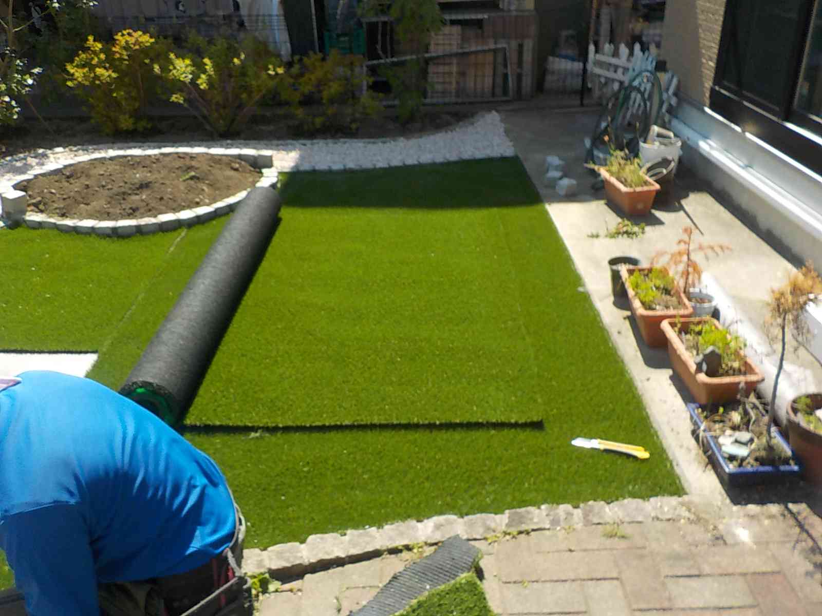 アプローチ、人工芝の下地には防草シートを敷き込み、雑草の発生を抑制しております。