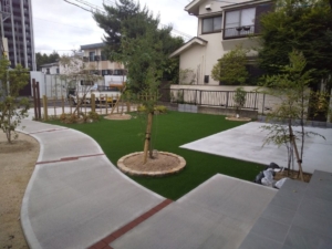 さらに、土や砂利目地だった箇所をコンクリートやインターロッキングで舗装し、ほうき一本でサッと掃除ができる、メンテナンス性の高いお庭に。